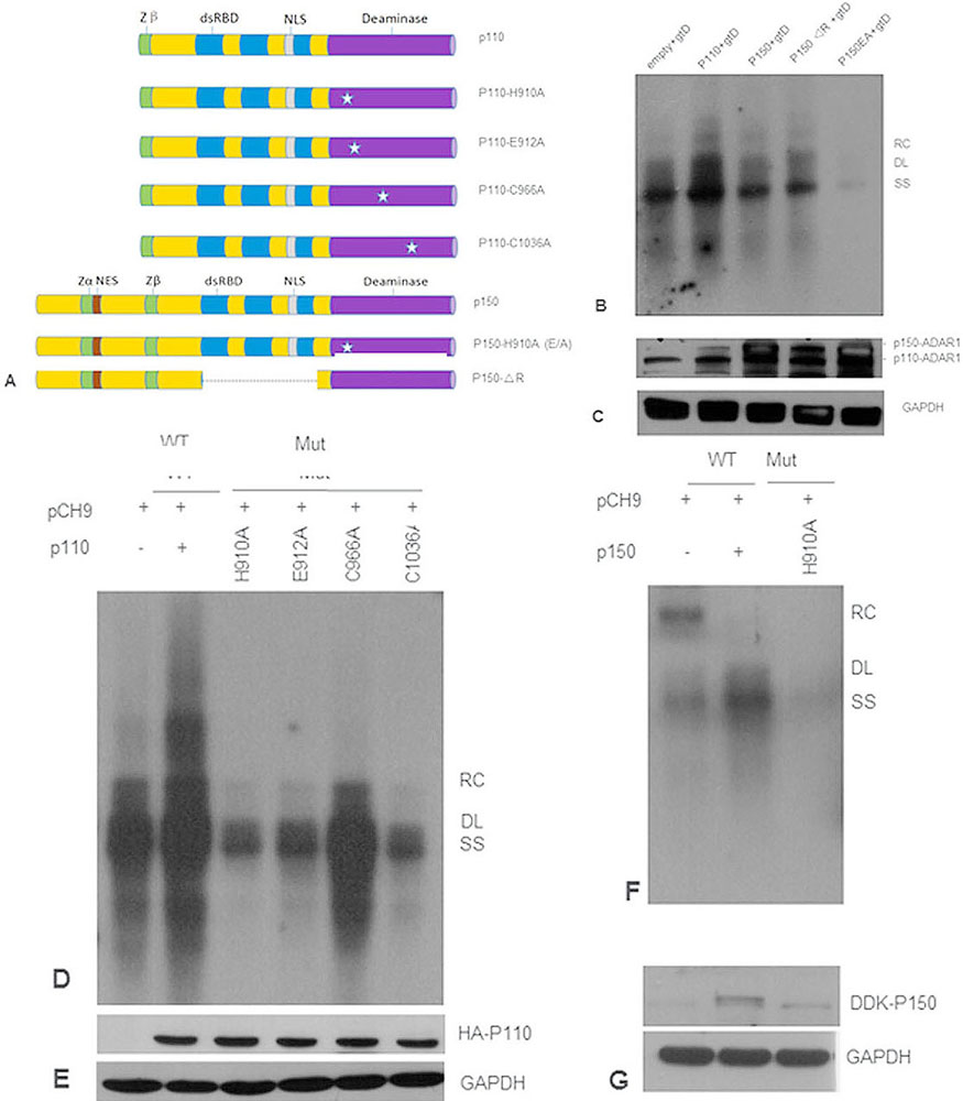 Figure 4RNA editing and RNA binding domain of ADAR1 are required to promote HBV replication. (A) Schematic representation of human ADAR1 (p110 and p150) and its mutant constructs (p110H910A, p110E912A, p110C966A, p110C1036A, and p150H910A). The asterisks indicate the position of replaced amino acid in the catalytic domain of ADAR1. HBV replicative intermediates were detected by Southern blotting in Huh7 cells transfected with ADAR1 p110, ADAR1 p150 or its mutant expression plasmid (B, D, and F). Level of ADAR1 protein and its mutant constructs were confirmed by Western blotting using anti-HA or anti-DDK antibody (C, E, and G). GAPDH was used as an internal control.