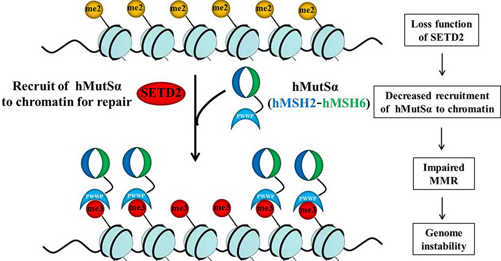 DNA mismatch repair (MMR) ensures replication fidelity by correcting insertion/deletion loops and base-base mismatches generated during DNA replication. hMutS-alpha (MSH2-MSH6) complex plays a pivotal role in MMR. Li et al. reported that the hMSH6 PWWP domain as a histone modification reader and can interact directly with H3K36me3. Thus, hMutS-alpha complex is recruited to the chromatin. Once SETD2 is inactivated, the recruitment of hMutS-alpha to the damaged DNA sites will be decreased (58). As illustrated in Figure 3, this finding explained why some MSI-positive cancer cells do not bear mutations of the well-studied MMR genes.