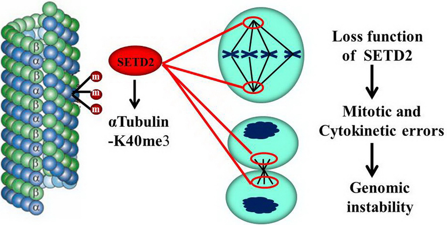 A recent discovery by Park et al. showed that SETD2 can maintain genomic stability by keeping the proper function of α-tubulin during mitosis and cytokinesis. SETD2 can tri-methylate α-tubulin on lysine 40 (α-TubK40me3), and ablation of SETD2 causes defects of mitotic spindle and cytokinesis, micronuclei, and polyploidy. This study suggested that the genomic unstable oncogenic phenotypes of SETD2-mutated cells may be caused by tubulin defects during cytokinesis and mitosis, as illustrated in Figure 4 (58). Nevertheless, this mechanism leading to chromosomal instability in colorectal cancer remains to be determined.