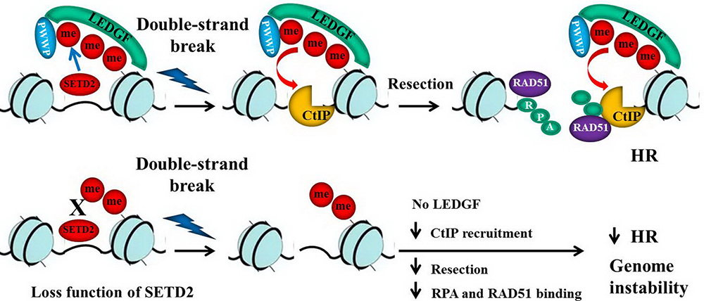 Figure 2PWWP domain of LEDGF can recognize H3K36me3, through which LEDGF can be recruited to DSBs to initiate DNA repair. LEDGF recruits CtIP, RPA, and RAD51, which promotes resection, an essential step in HR repair. Without H3K36 trimethylation, chromatin LEDGF association could be compromised, CtIP, RPA, and RAD51 cannot be recruited, which will impair resection and HR, leading to deletions and subsequent genome instability and tumorigenesis.