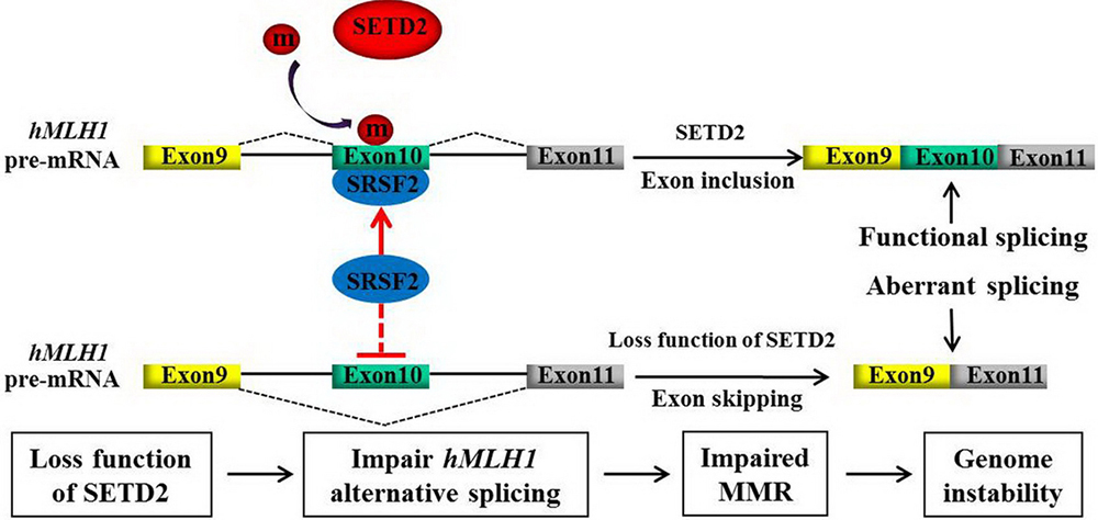 Figure 1With normal H3K36me3 level surrounding hMLH1 exon 10–11, medicated by SETD2, SRSF2 can be recruited to the functional splicing sites to enhance normal splicing. With SETD2 inactivation, aberrant splicing happens and this leads to inactivation of hMLH1 and high-frequency microsatellite instability.