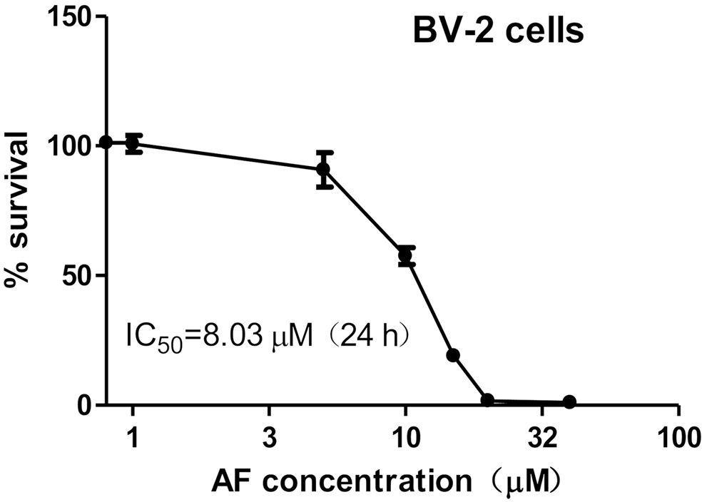 Figure 1The cell viability was significantly decreased as the concentration of AF increased. In BV-2 cells, 50% inhibition after 24 h was found at an AF concentration of 8.03 μM (IC50 = 8.03 μM).