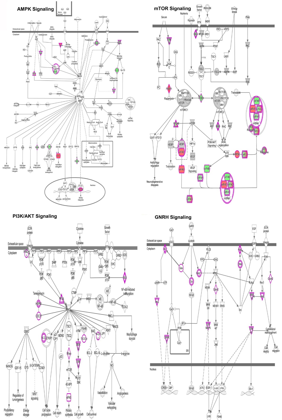 Figure 3Schematic diagrams of the four most significant canonical pathways identified by IPA analysis.