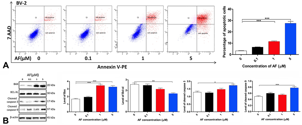 Figure 4Pro-apoptotic effect of AF on BV-2 cells. A: Apoptosis of BV-2 cells was induced by AF in a dose-dependent manner. B: Western blot analysis was performed to analyze protein expression of BAX, BCL-XL, cleaved caspase-3, and cleaved caspase-9, and these proteins were significantly differentially regulated by AF during induction of apoptosis. * P < 0.05, ** P < 0.01, *** P < 0.001, compared with 0-μM AF treatment group.