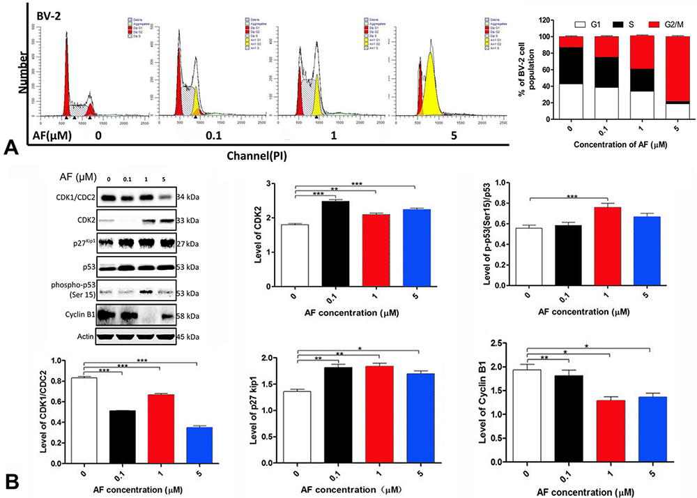 Figure 5Cell cycle regulatory effect of AF on BV-2 cells. A: With AF at 5 μM, the BV-2 cell population at S phase 2 was significantly decreased whereas cells accumulated significantly at G2/M phase. B: Western analysis was performed to analyze protein expression of CDK1/CDC2, CDK2, p27Kip1, p53 and cyclin B1. Expression of these proteins was significantly differentially regulated by AF, which induced cell cycle arrest at G2/M phase. * P < 0.05, ** P < 0.01, *** P < 0.001, compared with 0-μM AF treatment group.