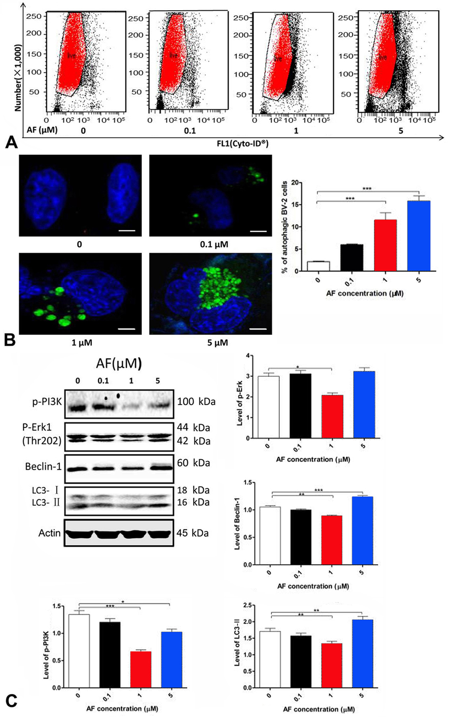 Figure 6Autophagy was induced by AF in BV-2 cells. Flow cytometry (A) and confocal microscopy (B) were performed to detect autophagy induced by different concentrations of AF in BV-2 cells (scale bar: 5 μm; the green signal stands for autophagosome, and the blue stands for nuclear). C: Western blot analysis was performed to analyze protein expression of p-PI3K, PI3K, p-Erk1, Beclin-1 and LC3, involved in regulation of autophagy signaling pathways, and these proteins were significantly differentially regulated by AF in BV-2 cells. * P < 0.05, ** P < 0.01, *** P < 0.001, compared with 0-μM AF treatment group.