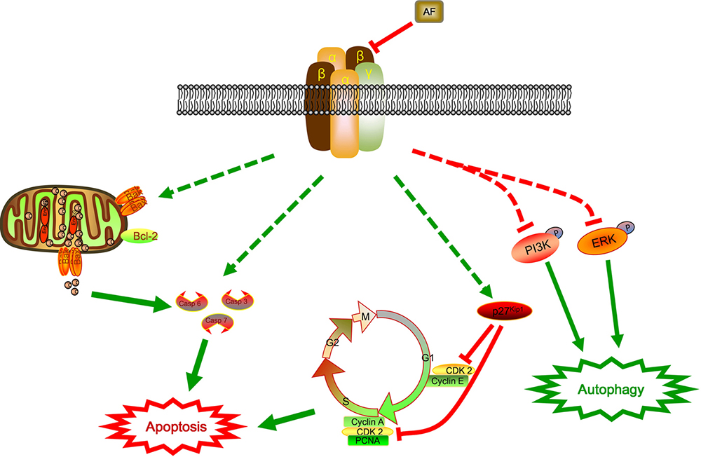 AF was purchased from KINDU (Shanghai, China). Dimethyl sulfoxide (DMSO), fetal bovine serum (FBS), ammonium persulfate, dialyzed FBS, ribonuclease (RNase A), propidium iodide (PI), protease and phosphatase inhibitor cocktails, bovine serum albumin, MTT (3-(4,5-dimethylthiazol-2-yl)-2,5-ditetrazoliumbromide), Dulbecco's phosphate-buffered saline (PBS) and ethylene diaminetetraacetic acid (EDTA) were obtained from Sigma-Aldrich (St Louis, MO, USA). Pierce™ bicinchoninic acid (BCA) protein assay kit, radioimmunoprecipitation assay (RIPA) buffer, skim milk and Western blotting substrate were obtained from Thermo Fisher Scientific Inc. (Waltham, MA, USA). The annexin V/PE (phycoerythrin) apoptosis detection kit was obtained from BD Biosciences Inc. (San Jose, CA, USA). Cyto-ID autophagy detection kit was obtained from Enzo Life Sciences Inc. (Farmingdale, NY, USA). The primary antibodies against human CDK1/CDC2, CDK2, p27Kip, p53, p-p53 (Ser15), cyclin B1, BAX, BCL-XL, cleaved caspase-3, cleaved caspase-9, p-PI3K, p-Erk (Thr202), Beclin-1 and LC3 were all purchased from Cell Signaling Technology Inc. (Beverly, MA, USA). The antibody against human β-actin was purchased from Santa Cruz Biotechnology Inc. (Dallas, TX, USA).