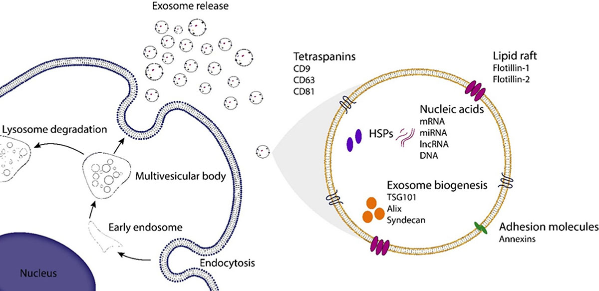 Figure 1Exosome biogenesis begins with invagination of the plasma membrane to form early endosomes. Early endosomes mature into multivesicular bodies (MVBs), with invagination of the membrane generating intraluminal vesicles. MVBs either fuse with lysosomes for degradation, or fuse with the plasma membrane, thus releasing the intraluminal vesicles as exosomes. Exosomes carry proteins, lipids and genetic materials such as mRNA, miRNA, lncRNA and DNA. Exosomes are characterised by the presence of marker proteins, such as tetraspanins (CD9, CD63, and CD81), heat shock proteins (HSPs), lipid raft proteins (flotillin-1, flotillin-2), adhesion molecules (annexins) and by endosomal sorting complexes required for transport (ESCRT) proteins (TSG101, Alix, and Syndecan).