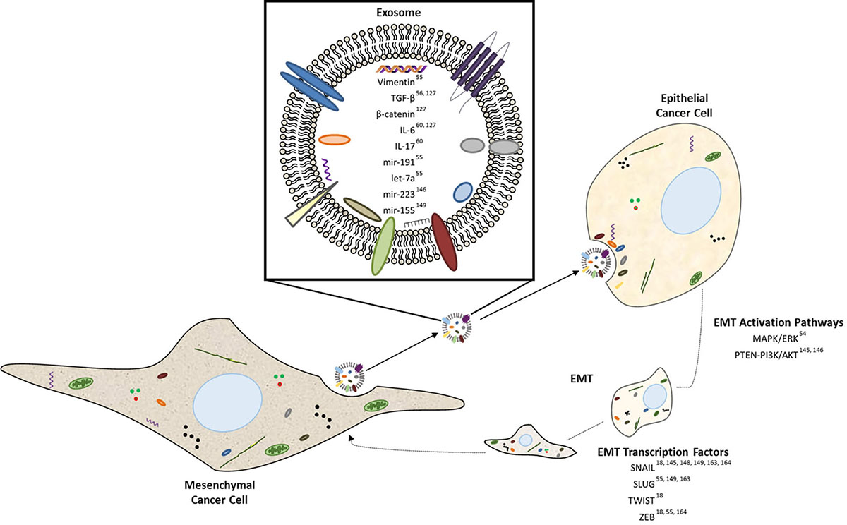 Figure 2Exosomes derived from metastatic, mesenchymal cells carry pro-EMT factors to recipient epithelial cells, consequently inducing EMT. Pro-EMT factors include Vimentin, TGF-β, β-catenin, interleukins-6 and -17, and several miRNA. Uptake of these factors result in the activation of EMT pathways and subsequently EMT transcription factors. Numbers listed refer to citations in the reference list.