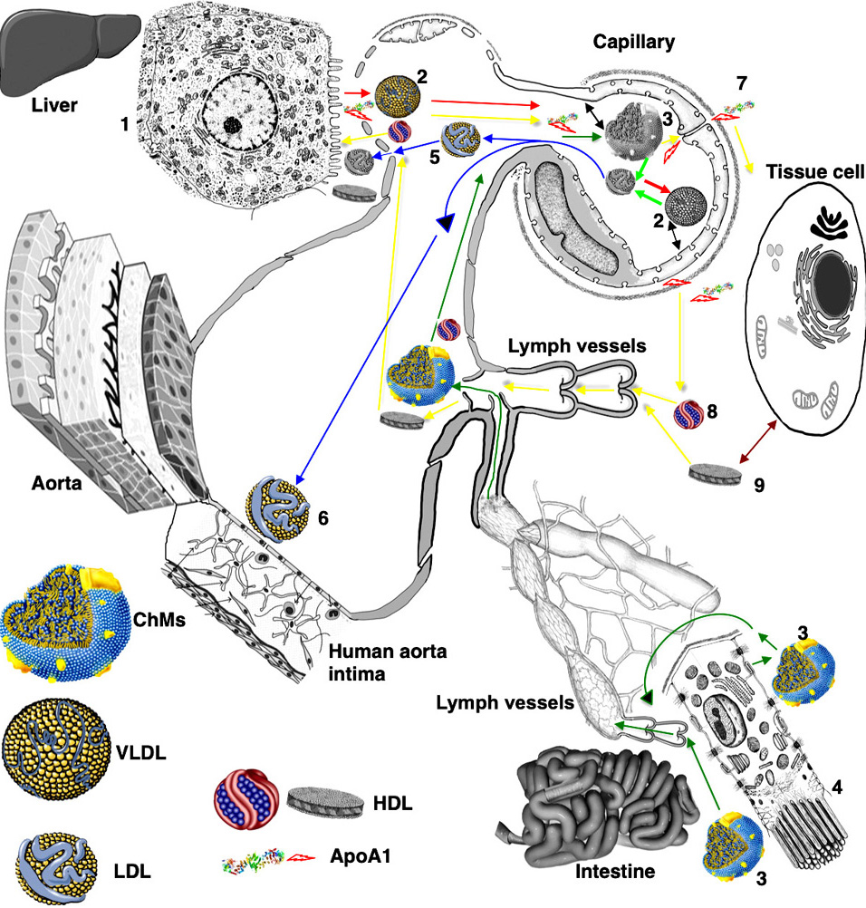 Secretion, transcytosis and endocytosis of low density lipoproteins (LDL), very LDL (VLDL), high-density lipoprotein (HDL), and chylomicrons (ChMs) are important for atherogenesis because most tissue cells (cells of nervous system and hepatocytes are exclusions) do not synthesize cholesterol and need to acquire this lipid from the blood apolipoproteins. In hepatocytes, cholesterol and free fatty acids (FFAs) are synthesized in the cytosol and then on the cytosolic leaflet of the membrane of the smooth endoplasmic reticulum ER (SER). VLDLs are formed in the lumen of the SER. Apolipoprotein (Apo) B is synthesized in the granular ER (GER), diffuses to the SER and extracts cholesterol and FFAs from the SER membrane generating VLDL. These particles are formed inside the lumen of the SER near the border between the SER and GER. Assembly of VLDLs at SER is regulated by a chaperone called microsomal triglyceride transfer protein (11).