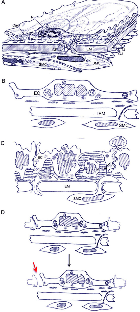 Figure 2Scheme of the structure of aorta intima in rats (A, B) and its alteration in hypertensive animals and in area of (C, D). (B) Simplified scheme of the aortic intima. (C) Accumulation of multilayered basement membrane (arrow) below endothelial cells. Movement of SMC from media into intima (thick arrow). Macrophages (M) in intima. (D) Effect of deregulation of endothelial contractility through eNOS and other stimuli. Excessive EC contraction could open tight junctions (to the right). Red arrow shows the open contact between ECs. Abbreviations: Cav, caveola; CF, collagen fibrils; EC, endothelial cell; GJ, gap junction; IEM, internal elastic membrane; M, macrophage; N, nucleus; SMC, smooth muscle cell; TJ, tight junction.