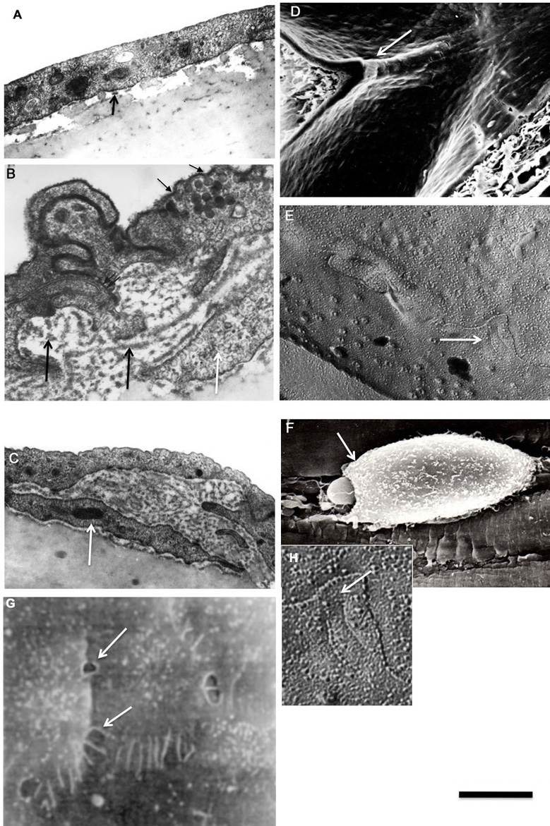 Figure 3Ultra-structure of atherosclerosis (originals). (A) Structure of aortic endothelium under normal conditions. BM (arrow) is perforated. (B, C) Structure of intima in the area of hemodynamic stress. Accumulation of layers of the BM below endothelial cells (black arrows). Pericyte-like cell (white arrow) is present below ECs. (B) Ruthenium red stains caveolae. (D) Divider of the blood blow in rat aorta. Scanning electron microscopy (SEM). (E, H) Platinum replicas of endothelial cell prepared after freeze-fracture. White arrows show the opening within rows of intramembrane particles forming tight junction. (E) Evaporation from low-left corner. (H) Evaporation from the right side. (F) During mitosis inter-endothelial contacts became open and platelets attached to BM. (G) SEM of open contacts (white arrows) between ECs at the sites of altered flow pattern according to Cunningham and Gotlieb (2005) in the human aorta (sample from Kolpakov et al., 1996). Scale bars: 700 nm (A, E); 350 nm (B, H); 1.4 µm (C); 1 mm (D); 4.7 µm (F); 1.8 µm (G); 350 nm (H).