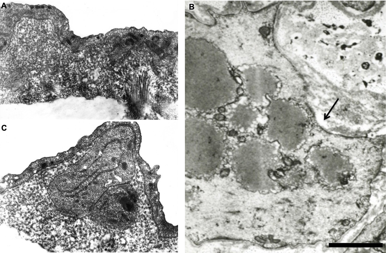 Figure 4Ultra-structure of the aorta of normal and hypertensive rats as well as of the aorta of the rabbit subjected to cholesterol feeding. (A) Accumulation of multilayered BM below aorta ECs of rat with arterial hypertension. (B) SMC with lipid granules has the PM with areas not covered with BM (arrow). (C) Appearance in the intima of the foam cell (lipid droplets in lysosomes) derived from smooth muscle cell. Arrow shows the PM of this smooth muscle cells not covered with the basement membrane. Scale bars: 1.4 µm (A, C); 1 µm (B).