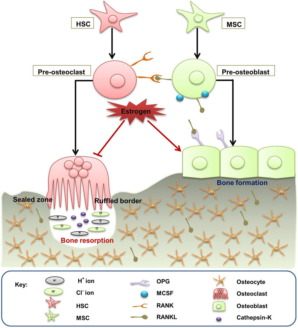 Figure 1Bone remodeling. Bone is remodelled by the combined actions of osteoclasts, osteoblasts and osteocytes. Activated pre-osteoblasts and pre-osteoclasts express RANKL and RANK receptor, respectively. RANK/RANKL binding induces pre-osteoclasts proliferation to form mature osteoclasts resulting in osteoclastogenesis. On the other hand, mature osteoblast expressing the decoy receptor OPG helps in the formation and prevention of excessive bone resorption. Estrogen inhibits bone destruction by maintaining the coupling between osteoclastogenesis and osteoblastogenesis.