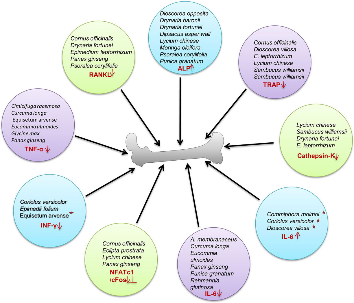 It is widely known as Rehmannia root, Sheng Di Huang, Rehmannia glutinosa Libosch. This plant is used in Chinese medicine and is known for its potential anti-osteoporotic and bone-strengthening components. Both in vitro and in vivo studies explain its prime role in the treatment and protective effect for osteoporosis. The plant extract enhances the proliferation and ALP activity of osteoblasts (190), mRNA expressions of bone-related genes, increased BMD, cortical bone thickness and OPG secretion, while decreasing resorption area and formation of TRAP multinucleated cells (25). Its immune-potentiating properties are shown by reduced serum TNF-α, IL-6 and collagen (type I) levels in postmenopausal women (191).