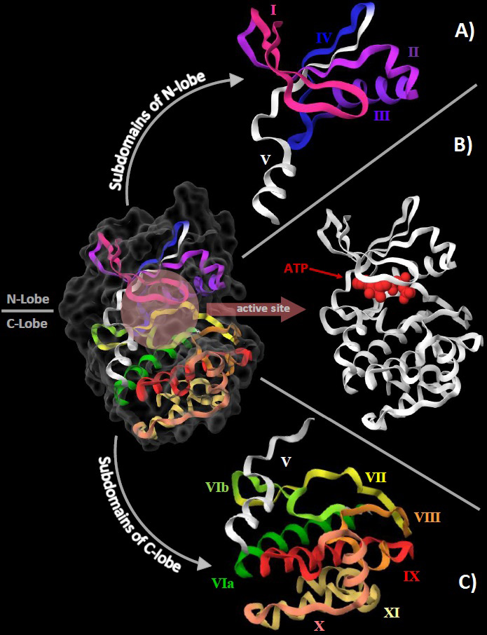 Figure 1The structural organization of the eukaryotic protein kinase domain using the crystal structure of cAMP-dependent protein kinase (PDB:1ATP) as reference. A. The 4 subdomains of N-lobe are represented with roman numerals from I to IV. Subdomain V (white) traverses between the 2 lobes. B. The orthosteric/active site is shown here at the cleft between the 2 lobes with a molecule of ATP (red) already bound to it. C. The 7 subdomains of the C-love are shown here with roman numerals from VIa to XI with subdomain V (white).