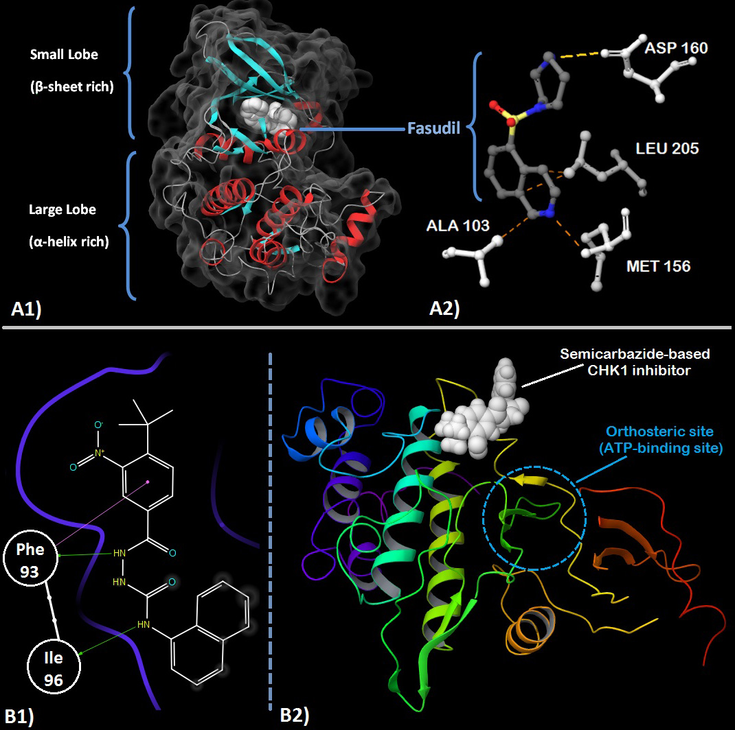 Figure 2A1. Crystal structure of ROCK1 showing the small and large lobes and Fasudil (white) at the orthosteric site. Secondary structure with α-helices (red), β-sheets (cyan) and turns/loops (grey) can be seen with the solvent accessible surface contours (dark grey). A2. Fasudil’s (grey carbons) interaction with residues (white) present in the orthosteric site of ROCK. Methionine 156 is involved in hydrogen bonding with the nitrogen of the isoquinoline ring while Asparatic acid 160 forms a hydrogen bond with the nitrogen of homopiperazine ring. Alanine 103 and Leucine 205 provide stabilizing hydrophobic interactions with the orthosteric site. (PDB: 2ESM). 59 B1. 2D-ligand interaction diagram of an allosteric semicarbazide CHK1 inhibitor. The phenyl group of Phe 93 is involved in a pi-pi stacking interaction with the nitro-substituted benzene ring of the inhibitor while its carbonyl oxygen forms a hydrogen bond with the hydrazide group of the semicarbazide group. Ile 96 forms a hydrogen bond with the nitrogen atom of the 1-amino substituent of the naphthalene ring. B2. The 3D view shows the inhibitor bound at the allosteric site which is clearly distinct & distant (~18Å) from the orthosteric site. (PDB: 3JVS) 92