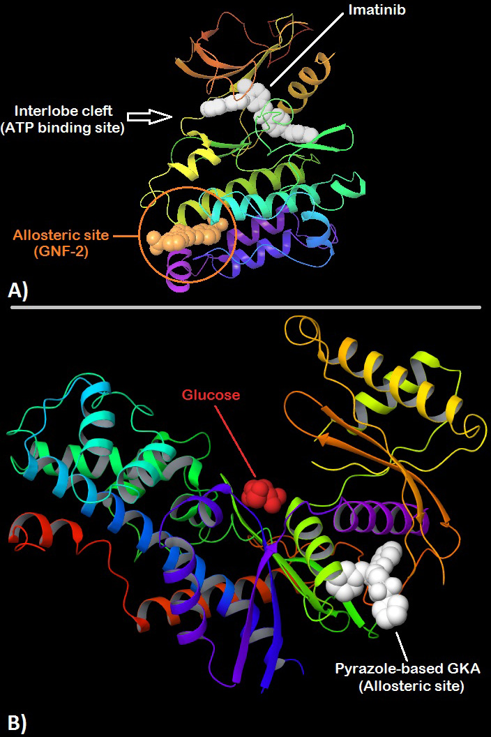 Figure 3A. 3D structure of ABL kinase showing Imatinib (white) bound to the orthosteric site present at the interlobe cleft while GNF-2 is shown bound to a distant (~30Å) allosteric site also called the myristate binding site in the large lobe. (PDB:3K5V) 151 B. 3D structure of human Glucokinase with bound glucose (red) nearby the orthosteric site at the interlobe cleft and a pyrazole-based glucokinase activator (white) bound to the allosteric site which is present posterior to the interlobe cleft at a distance of about ~25Å. (PDB:5V4X) 156.