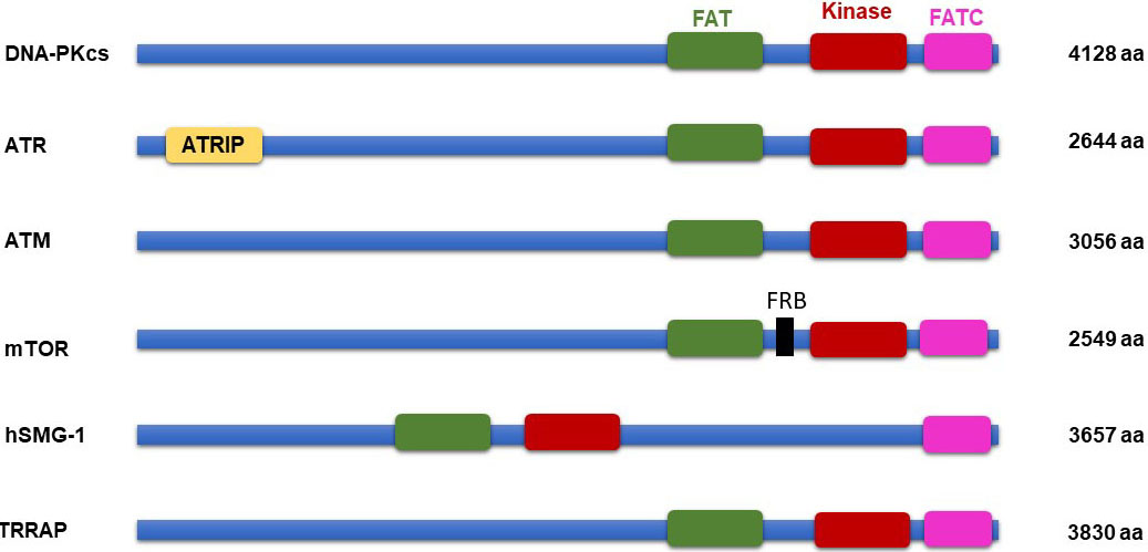 Many of the PIKKs are larger proteins (2549 and 4128 amino acids), have high sequence similarity in their catalytic PIKK kinase domain and share common domain architecture (12-13). The essential kinase domain is located close to the C-terminal end and surrounded by the FAT domain (37- 47 amino acids) on N-terminal (named after the kinases FRAP, ATM, and TRRAP) and a unique FATC domain (~35 amino acid) on its C-terminal side. The FAT and FATC domains are observed to be present in combination and suggest that they may interact with each other or participate in intermolecular protein-protein interactions. Also, it is speculated that they fold together in a conformation that ensures the proper functioning of catalytic kinase domain (14). In mTOR, FKBP- rapamycin binding (FRB) domain (100 residues) is assumed to be located in-between the FAT and catalytic domains, and the RAPTOR and RICTOR binding domain are observed on the N-terminal region of the FAT domain. The FATC domain is more conserved when compared to the FAT domain, it could be an essential domain for regulating kinase activity. Nevertheless, the exact function of the FAT and FATC domain are not firmly ascertained and, still need to be revealed experimentally. In ATR, there is an ATR-interacting protein (ATRIP) binding domain on N-terminus (15). ATRIP is an 85 kDa protein, it is required for binding of ATR to replicative protein A (RPA) on single-strand DNA breaks under replication stress. Also, ATRIP has topoisomerase binding protein I (TopBP1) region, which helps in the interaction of ATR with TopBP1. It is essential for activating cell cycle checkpoints for cell survival with respect to DNA damage (16). On the other hand, an FKBP12-rapamycin binding (FRB) domain located between the FAT and kinase domain of mTOR and SMG, has an inhibitory effect on mTOR function (17) (Figure 1).