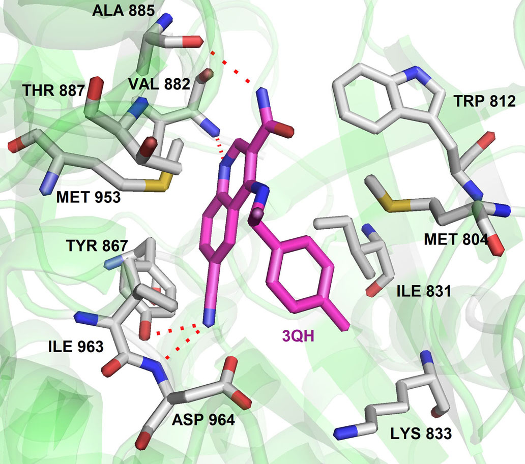 Figure 9The binding pose of compound 3QH with ATM homology (PI3Kγ). Protein structure highlighted as the green color and interacting residues are represented as tube model (grey color). 3QH was highlighted as tube model (magenta color) (Adapted with permission from PDB ID : 5G55) and hydrogen bonding was highlighted as dotted lines.