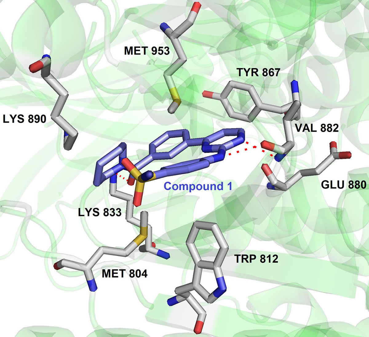 Thereby, it enhanced the cytotoxicity of the major classes of DNA-damaging agents for effective cancer therapy. Importantly, NU6027 was found to be synthetically lethal when DNA single-strand break repair was impaired either through poly (ADP-ribose) polymerase (PARP) inhibition or defects in XRCC1. Hence NU6027 can serve as the novel lead for further drug development of pyrimidine derivatives against ATR (Figure 11). In another study, Gopalswamy et al. screened a panel of kinase library and discovered compound 1 as a hSMG1 inhibitor in sub-micromolar range ( IC50 = 0.45µM) (97). They further optimized compound 1 to reduce its activity against CDK1 by docking into the active site of hSMG1 homologous protein PI3Kγ. In the active site (PDB ID : 4FUL), compound 1 showed U shape conformation and was stabilized by hydrogen bonding interaction between the nitrogen of pyrimidine ring and the Val882 positioned in the backbone of ATP binding pocket. In addition, amino group and the carbonyl oxygen of compound1 form multiple hydrogen-bonding interactions with Val882 and Lys833 (Figure 12).