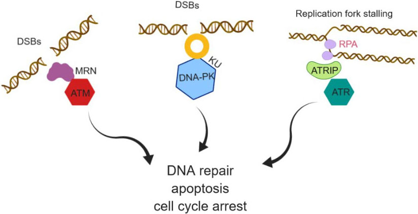 Replicating mammalian cell is constantly under exogenous and endogenous stress, which subsequently affect the integrity of the genome. To overcome this adverse effect and maintain the genomic stability, eukaryotic cells developed a highly organized and coordinated network of cellular events called a DNA damage response (DDR). ATM and ATR kinase are the first members of the PIKK family serine/threonine kinase senses the DNA damage and activate DDR pathway (Figure 2). DDR signaling pathway is initiated by the recognition of lesions in DNA structures by ATR and ATM kinases. ATR and ATM kinases interact with many other checkpoint proteins that co-localizes at the site of damage. For example, checkpoint kinase 1 (Chk1) and checkpoint kinase 2 (Chk2) activity are mainly modulated by ATR and ATM kinase. This results in the S phase and G2 phase arrest during cell cycle (39-41). ATM and ATR to respond to different types of DNA damage (Figure 2). DSBs (ionizing radiation) activate ATM, which can phosphorylate BRCA1, and Chk2 kinase leading to activation of p53 followed by G1/S arrest or apoptosis. The localization of ATM kinase to DSBs is chiefly regulated by the Mre11-Rad50-Nbs1 (MRN) complex (42). Studies have shown that MRN is one of the first sensors to be recruited to DSBs (43). The unwinding of DNA ends by MRN complex stimulates the activity of dimeric/oligomeric ATM kinase (42). ATM kinase was discovered in ataxia-telangiectasia (AT) patients, characterized by dilated blood vessels and progressive neurological decline. AT results in gait abnormality and a lack of involuntary movement. AT patients are oversensitive to IR radiation and are defective in DSB repair just as the G1/S, intra-S, and G2/M checkpoints. The defective checkpoints in AT cells are mainly due to the lack of ATM kinase (44). ATM was orthologous to Saccharomyces cerevisiae Tel1 (45-46), a protein involved in controlling telomere length, DNA repair, and cell-cycle checkpoint control. ATM additionally phosphorylates the Ser139 in the C-terminal tail of histone variant H2AX in response to DSBs, bringing about discrete γ-H2AX foci at the DNA damage sites (47). H2AX phosphorylation is a general cellular response to processes involving DSB intermediates. p53 is another substrate of ATM which gets phosphorylated on Ser15 in response to DSBs. Phosphorylation of p53 leads to the degradation of Mdm2 and subsequent G2/M cell cycle arrest (48).