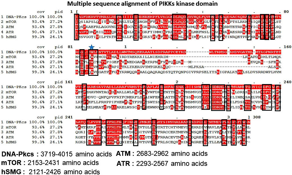 Figure 3Multiple sequence alignment of PIKK family kinases (ATR, ATM, DNA-PKcs, and hSMG) kinase domain. Conserved residues are highlighted in red color.