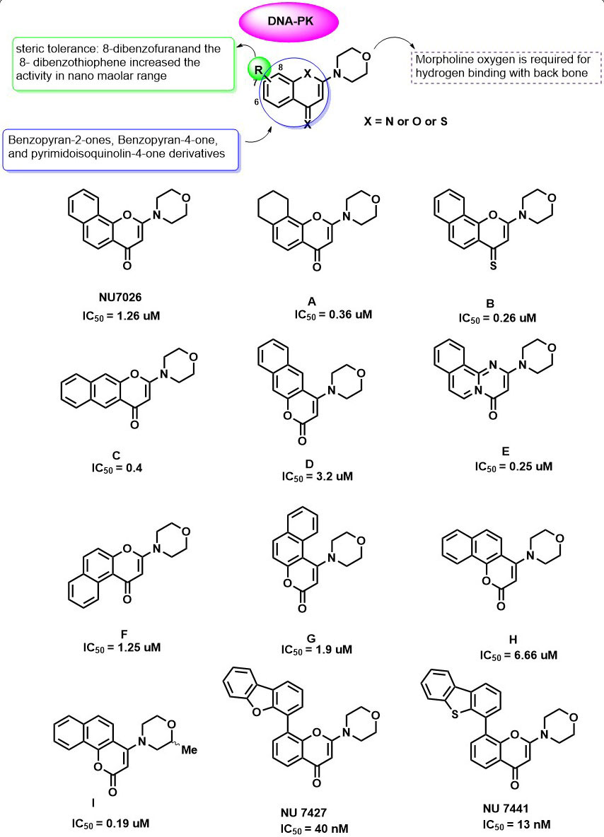 In 1993, Vlahst et al., first reported the2-(4-morpholinyl)-8- phenyl-4H-l-benzopyran-4-one (also known as LY2940002) as a specific inhibitor of Phosphatidylinositol 3-Kinase with IC50 = 0.43 µg/d 1.40 µM (74). On the basis of similarities between the catalytic subunit of Phosphatidylinositol 3-Kinase and DNA-PK, Izzard et al., and others carried out the inhibition studies of LY2940002 on DNA-PK and demonstrated that LY2940002 was also able to sensitize cells to the effects of IR (IC50 = 6 µM) (75). The crystal structure analysis of LY2940002 with porcine PI3K (p110γ) revealed that morpholine oxygen is required to form hydrogen bonding with backbone Val882 in the ATP binding pocket also, the ATP binding pocket of PI3K is very similar to that of the PIKK family kinases. These results led to the investigation of LY2940002 derivatives as PIKK family kinase inhibitors. In 2005, a diverse range of Benzopyran-2-ones, Benzopyran-4-one, and pyrimidoisoquinolin-4-one derivatives (Figure 5: A-I) were investigated for their inhibitory activity against the DNA-PK (IC50 values ranging from 0.19 to >10 μM) (76). In this study, all the fused chromones systems were able to inhibit PIKK family kinases in the presence of PI3K isoforms and proved to have a superior activity than LY2940002. NU7026 was identified as a potent inhibitor of DNA-PK with IC50 = 1.26 µM. Further, they also investigated the isosteric pyrimido(2,1-a)isoquinolin-4-one, which showed comparable activity with that of NU7026. Interestingly, structure-activity relationship studies on 2-position of pharmacophore template LY2940002 and NU7026 (74, 77) for DNA-PK inhibition has led to the identification of excellent DNA-PK inhibitor compound I (NU7163). Compound I showed ATP competitive inhibition of DNA-PK with an IC50 value of 0.19 μM. Effect of 2- methyl substitution on the morpholine ring was not detrimental due to the unavailability of the crystal structure of DNA-PK, but it greatly improved the activity against DNA-PK. An in-vitro study of NU7026 and I (5 μM and 10 μM) on HeLa cell lines showed an enhancement of cytotoxicity in combination with radiation therapy (76). In another study, Ian et al., explore the various functional groups at 6, 7 and 8th position of NU7026 and discovered two compounds, 2-N-morpholino-8-dibenzofuranyl-chromen-4-one (NU7427) and the 2-N-morpholino-8-dibenzothiophenyl-chromen-4-one NU7441) with excellent DNA-PK inhibition (IC50 DNA-PKcs =40 and 13 nM, respectively). In which substitution at the 8th position of Benzopyran-4-one markedly improved the inhibitor activity, and substitution at 6 th and 7th led to the loss of activity.