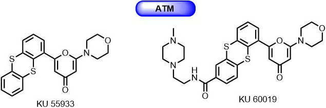 Through screening of a small library of molecules developed for PIKK family kinase, Hickson et al., identified a novel 2-morpholin-4-yl-6-thianthren-1-yl-pyran-4-one (KU 55933) as ATP competitive inhibitor for ATM with IC50 of 13 nmol/L and a Ki of 2.2 nmol/L (78) (Figure 5). It displayed 100-fold selectivity over DNA-PK and other PIKK family members. KU-55933 successfully inhibited the IR dependent phosphorylation of various ATM substrates such as p53, γH2AX, NBS1, and SMC1. Also, it is known that KU-55933 suppresses cell proliferation and induces apoptosis by inhibiting the phosphorylation of Akt in response to insulin-like growth factor (79). Exposure of cells to KU-55933 along with chemotherapeutic agents (doxorubicin, etoposide, and camptothecin)/ IR radiation resulted in significantly sensitization and cytotoxicity.Further, optimization of KU-55933 has led to the discovery of novel thianthrenpyran-4-one derivative (KU-60019) with improved selectivity (Figure 6). The second-generation ATM inhibitor KU-60019 showed 10 times more potency than its predecessor KU-55933 with little to no nonspecific target effects at 1 µmol/L against a panel of 229 protein kinases (80).