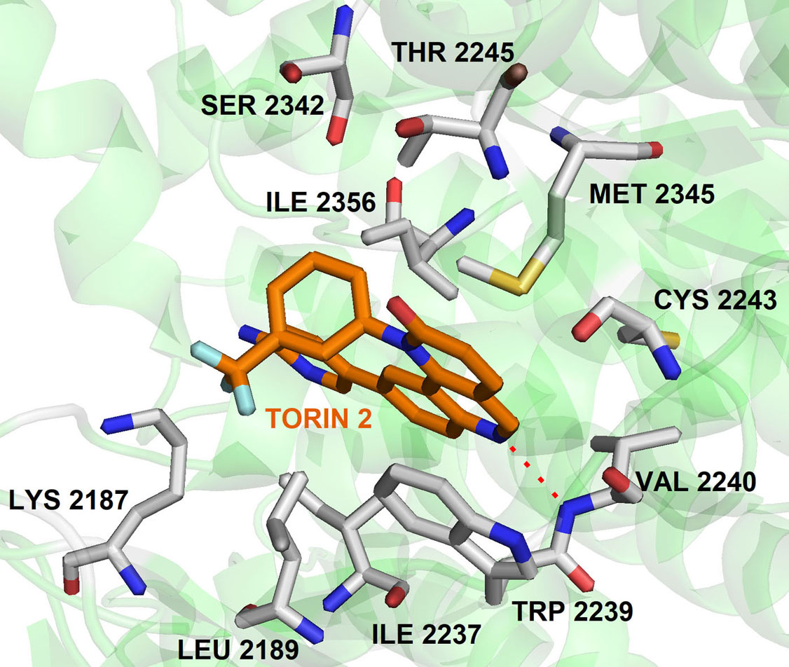 It is known that quinolines have a broad spectrum of biological activities such as antimalarial, analgesic activity, anti-inflammatory, antineoplastic, antifungal, anti-bacterial, antiviral, antiprotozoal, cardiovascular, CNS effects, hypoglycemic,) and others. Quinolines nucleus has great significance in cancer therapy, they are “privileged” ATP-site binders to the protein kinases in the signaling pathway. Many of the protein kinases are inhibited by several quinoline derivatives like, MAPKS, PKC, CK2, EGFR, IGF, PDGFR, CSF, and TGFβ. In 2010, Liu et al., screened a chemical library to identify selective mTOR kinase inhibitors. Their screening led to the discovery of quinoline scaffold 6-(pyridin-3-yl)-N-(3-(trifluoromethyl)phenyl)quinolin-4-amine with moderate inhibition against mTOR (mTORC1 IC50 = 5 μM). It was further optimized to improve the selectivity and the cellular potency to mTOR and managed to obtain Torin1 compound having cellular IC50 (mTOR) =2 nM; IC50 PI3K =1800 nM (81). In another study, they further optimized Torin1 to improve its selectivity, solubility, metabolic stability and led to the discovery of Torin2 (Figure 7). Torin2, 9-(6-aminopyridin-3-yl)-1- (trifluoromethyl)phenyl)benzo(h)(1,6)naphthyridin-2(1H)-one, derived from Torin1, has better half-life and bioavailability. It has been classified as second-generation ATP-competitive mTOR inhibitor with IC50 of 0.25 nM in the HCT116 cell line, which also showed inhibition of ATR and ATM kinase in kinativ scanning (82). Torin2 exhibits strong cellular activity against ATR with EC50 of 35 nmoles/L (HCT-116 cell lines) (82-83). Structural analysis of Torin2 and mTOR complex by Haijuan Yan et al.,(4) revealed the important residues and functional group involved in the stabilization of complex. In mTOR-Torin2 complex, the tricyclic benzonaphthyridinone ring occupies the adenine site of ATP and forms a hydrogen bond with the ‘hinge’ region. In addition, benzonaphthyridinone ring forms stacking interaction with the indole group of Trp 2239 (Figure 8).