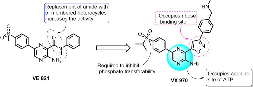 Further optimization of VE-821 resulted in a potent and selective ATP-competitive inhibitor i.e. VE-822 (VX-970) with an IC50 of 19 nM in HT29 cells. From the SAR studies, it was understood that the replacement of the amide group in 3-position of pyrazine with 5-member heterocyclic members like isoxazole, triazole, oxadiazole, pyrazole, dihydroisoxazole increased the inhibition towards ATR. Replacement with alkene, alkynes, ketone, and ethers has led to its inhibition at higher concentrations. On the other side, the substitution of CH3 in the sulfonyl group with various propyl, isopropyl, piperidine-3-yl, and piperidin-4-yl linkers showed great inhibitory effect along with the improved pharmacokinetic profile of 2-amino pyrazine series. The docking of VX-970 into the catalytic site of ATR revealed that pyrazin-2-amine group occupies the position of adenine (purine base) in ATP binding site. The 5-membered oxazole ring extends to the ribose binding region of ATP. Interestingly, the sulfonyl group of VX-970 occupies the position of the γ-phosphate group of ATP and is expected to prevent the γ-phosphate group transfer from ATP to substrate (93). In another study, published by Vertex Pharmaceuticals, VX-970 (VE-822) showed selective chemo-sensitization to a panel of non-small cell lung cancer cell lines, over normal cells, to multiple DNA damaging drugs, namely cisplatin, gemcitabine, and etoposide (94). In vivo investigation of VX-970 + cisplatin over a wide-range of the patient-derived primary lung, xenograft demonstrated that VX970 blocked ATR activity in tumors and dramatically enhanced the efficacy of cisplatin (94). These interesting results have led to the entering of VX-970 into phase I clinical trials (95). Preliminary clinical data showed that VX-970 can be used as single therapy/combinatorial therapy (in combination with Carboplatin) with early evidence of pharmacodynamics and antitumor activity. VX-970 is now being tested in phase 2 combinatorial/ monotherapy in patients with DNA repair defects (95).