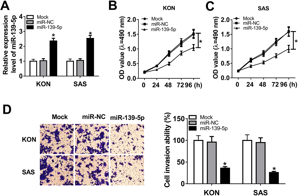Figure 2miR-139-5p overexpression inhibited cell proliferation and invasion in OSCC. (A) miR-139-5p expression in KON or SAS cells transfected with mock, miR-NC or miR-139-5p, individually. The relative expression of miR-139-5p in KON cells was 1±0.13 in mock transfected, 1.03±0.14 in those transfected with control miRNA (miR-NC) and 2.36±0.18 in cells that were transfected with miR-139-5p. The relative expression of miR-139-5p in SAS cells was 1±0.15 in mock transfected cells, 1.05±0.12 in cells transfected with miR-NC and 2.53±0.20 in those that were transfected with miR-139-5p. The proliferation of KON (B), SAS (C) and hNOK (D) cells transfected with mock, miR-NC and miR-139-5p at 0, 24, 48, 72, and 96 hours was assessed with MTT assay. (E) Transwell assay was used to assess the mobility of KON or SAS cells after mock transfection or transfection with miR-NC or miR-139-5p. The percent of cells that traversed the membranes were 100±11% in mock, 96±13% in miR-NC and 36±3.6% in miR-139-5p transfected cells. Data are expressed as means ± S.D. *p < 0.05.
