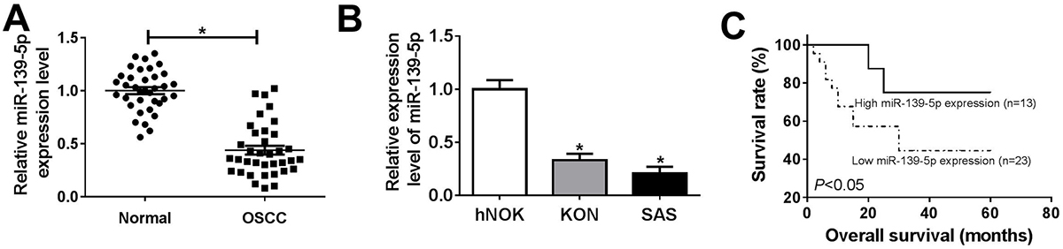 Figure 1miR-139-5p was downregulated in OSCC and related to survival. Based on the median value of miR-139-5p level, in 36 OSCC the tumors were classified into those with a high miR-139-5p (n=13) and low expression groupgroup (n=23). (A) The miR-139-5p expression in normal (n=36) and OSCC tissues (n=36). (B) The expression of miR-139-5p in human normal oral keratinocytes cell line hNOK, human oral squamous cell carcinoma cell line KON and SAS. (C) The tumor samples were divided into low group (n=23) and high group (n=13) by the median expression of miR-139-5p, and then the correlation between the overall survival of OSCC patients and miR-139-5 level was determined by Kaplan-Meier analysis. Data are expressed as means ± S.D. *p < 0.05. OSCC: oral squamous cell carcinoma.