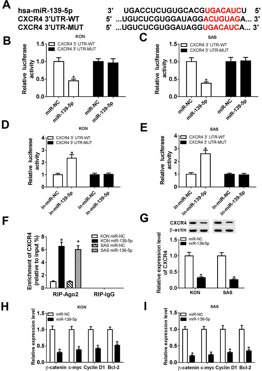 Figure 3CXCR4 was a target of miR-139-5p. The binding sites of miR-139-5p and CXCR4 were predicted by TargetScan Tool. (B and C) Relative luciferase activity of KON and SAS cells co-transfected with miR-NC or miR-139-5p and CXCR4 3’-UTR-WT or CXCR4 3’-UTR-MUT. (D and E) Relative luciferase activity of KON and SAS cells co-transfected with in-miR-NC or in-miR-139-5p and CXCR4 3’-UTR-WT or CXCR4 3’-UTR-MUT. (F) RIP assay was used to confirm the relationship between miR-139-5p and CXCR4. (G) The protein level of CXCR4 in KON and SAS cells was detected. (H and I) The mRNA levels of beta-catenin, c-myc, CyclinD1, and Bcl-2 were detected in miR-139-5p-transfected in KON and SAS cells. Data are expressed as mean ± S.D. *P < 0.05, r=-0.7735, miR-NC: negative control. in-miR-NC: negative control inhibitor. in-miR-139-5p: miR-139-5p inhibitor.
