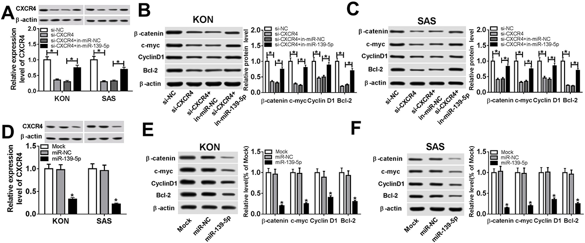 Figure 4miR-139-5p regulated Wnt/beta-catenin pathway via CXCR4. (A) Protein expression of CXCR4 in miR-139-5p inhibitor and si-CXCR4-transfected KON or SAS cells. (B) Protein expression of beta-catenin, c-myc, CyclinD1, and Bcl-2 in KON cells after transfection of miR-139-5p inhibitor and si-CXCR4. (C) Protein expression of beta-catenin, c-myc, CyclinD1, and Bcl-2 in SAS cells after transfection of miR-139-5p inhibitor and si-CXCR4. (D) Protein expression of CXCR4 in miR-139-5p overexpression-transfected KON or SAS cells. (E) Protein expression of beta-catenin, c-myc, CyclinD1, and Bcl-2 in KON cells after miR-139-5p overexpression. (F) Protein expression of beta-catenin, c-myc, CyclinD1, and Bcl-2 in SAS cells after miR-139-5p overexpression. Data are expressed as mean ± S.D. *p < 0.05. miR-NC: negative control. si-NC: siRNA of negative control. si-CXCR4: siRNA of CXCR4.