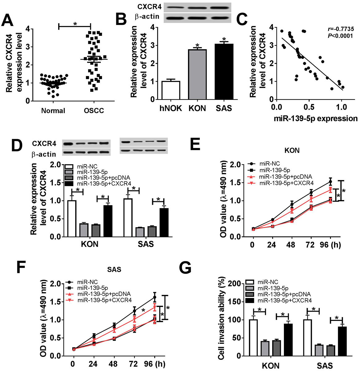 Figure 5CXCR4 restoration reversed the effects of miR-139-5p. (A) CXCR4 mRNA expression in normal (n=36) and OSCC (n=36) patients. (B) The protein level of CXCR4 in human normal oral keratinocytes cell line hNOK, human oral squamous cell carcinoma cell lines (KON and SAS). (C) The correlation between miR-139-5p and CXCR4 expression in OSCC patients. (D) CXCR4 protein expression in KON and SAS cells transfected with miR-NC, miR-139-5p, miR-139-5p + pcDNA, and miR-139-5p + CXCR4. (E) MTT assay was introduced to measure cell proliferation of KON cells transfected with miR-NC, miR-139-5p, miR-139-5p + pcDNA, and miR-139-5p + CXCR4. (F) The proliferation of SAS cells after the transfection with miR-NC, miR-139-5p, miR-139-5p + pcDNA, and miR-139-5p + CXCR4. (G) The cell invasion ability of KON and SAS cells transfected with miR-NC, miR-139-5p, miR-139-5p + pcDNA, and miR-139-5p + CXCR4. Data are expressed as mean ± S.D. * p < 0.05. miR-NC: negative control. CXCR4: pcDNA-CXCR4. pcDNA: negative control vector.