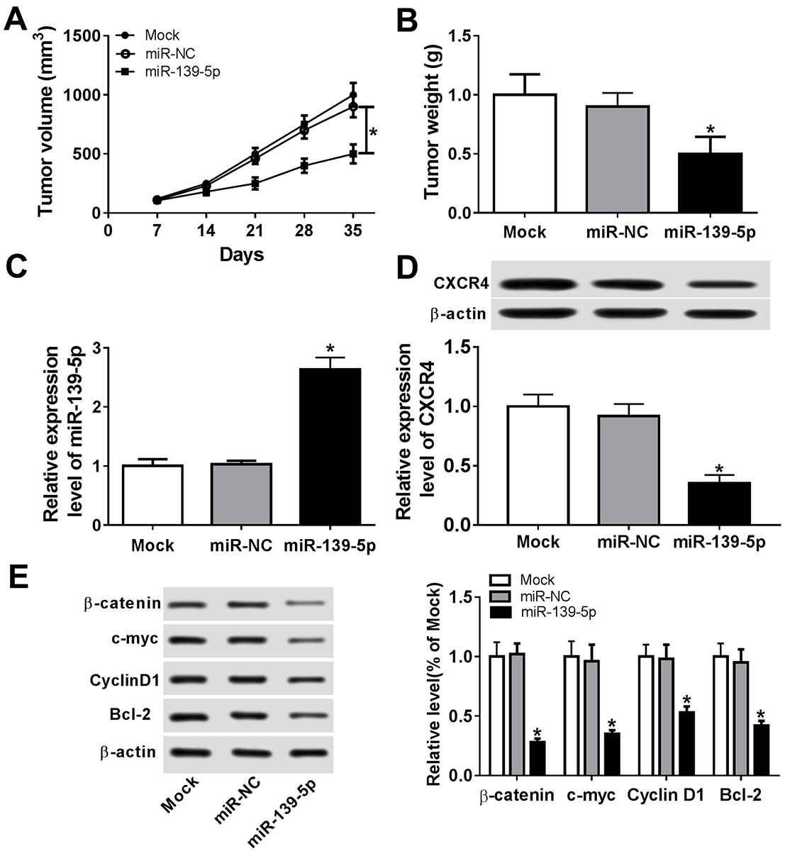 Figure 6miR-139-5p inhibited tumor development in vivo. 2x106 KON cells were subcutaneously inoculated in the upper flank of the nude mice. On day 7, 10 nmol miR-139-5p or miR-NC or no vector (Mock) was injected around the tumors with 0.1 mL Invivofectamine 2.0 (Invitrogen, USA) once per week per site for 4 weeks. Each group had 5 mice. (A) Tumor volume was measured once a week after injection. (B) The tumor weight in each group on day 35. (C) miR-139-5p expression in the tumor tissues of the nude mice on the 35th day. (D) CXCR4 expression in the tumor tissues on the 35th day. (E) The expression of beta-catenin, c-myc, CyclinD1, and Bcl-2 in tumor tissues on day 35. Data are expressed as mean ± S.D. *p < 0.05.