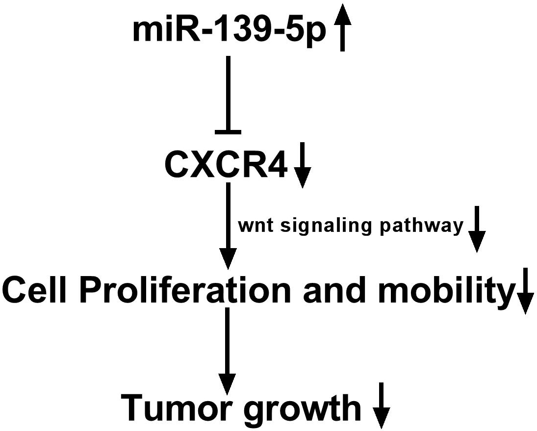 In conclusion, this study suggests that miR-139-5p plays an inhibitory role in OSCC development and progression via directly regulating the target gene, CXCR4 and its down-stream Wnt/beta-catenin signaling pathway in OSCC (Figure 7).