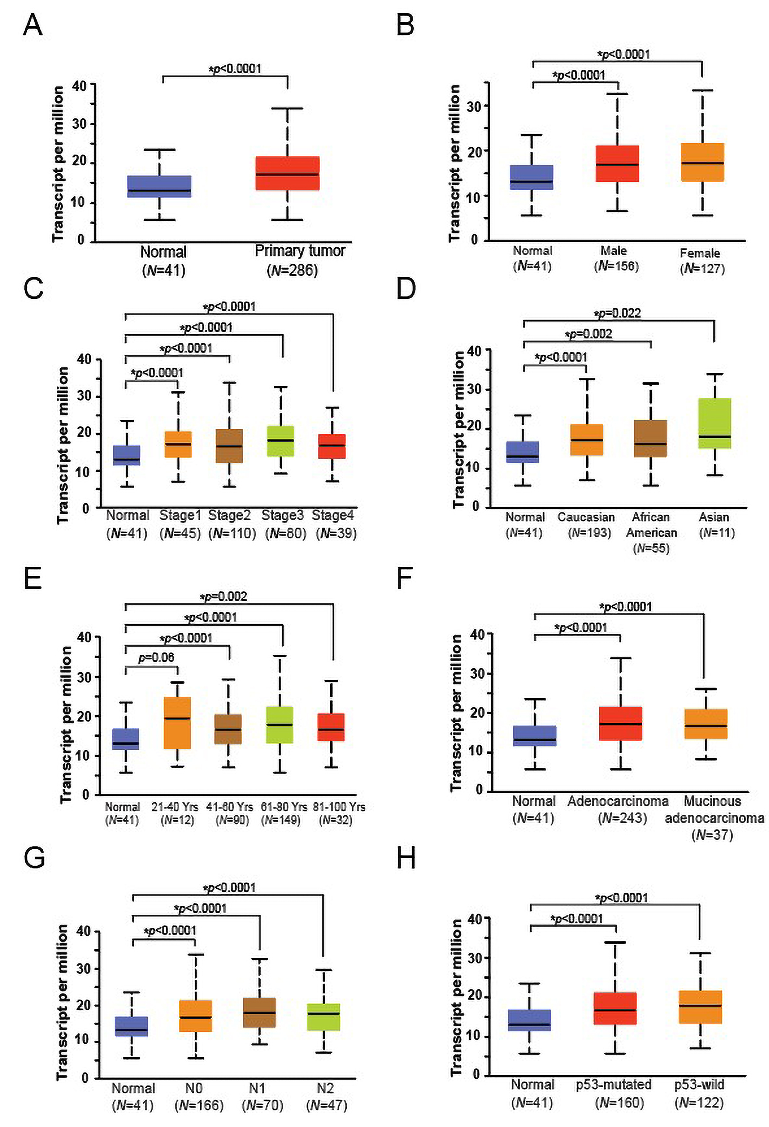 Fig. 1.MICA RNA expression in CRC tissues. (A) Box plots showing relative expression of MICA mRNA in uninvolved tissues and CRC (Student’s t-test). The mRNA expression levels were normalized as transcripts per million reads. (B) MICA expression in CRCs on the basis of patient sex, (C) various stages of CRC, (D) race, (E) age, (F) tumor histologic types, (G) nodal metastatic status, and (H) p53 mutation status (B–H, one-way ANOVA with Dunnett’s multiple comparisons test). Pairwise comparisons relative to normal tissue. CRC, colorectal cancer; MICA, MHC class I polypeptide-related sequence A; TCGA, The Cancer Gene Atlas.