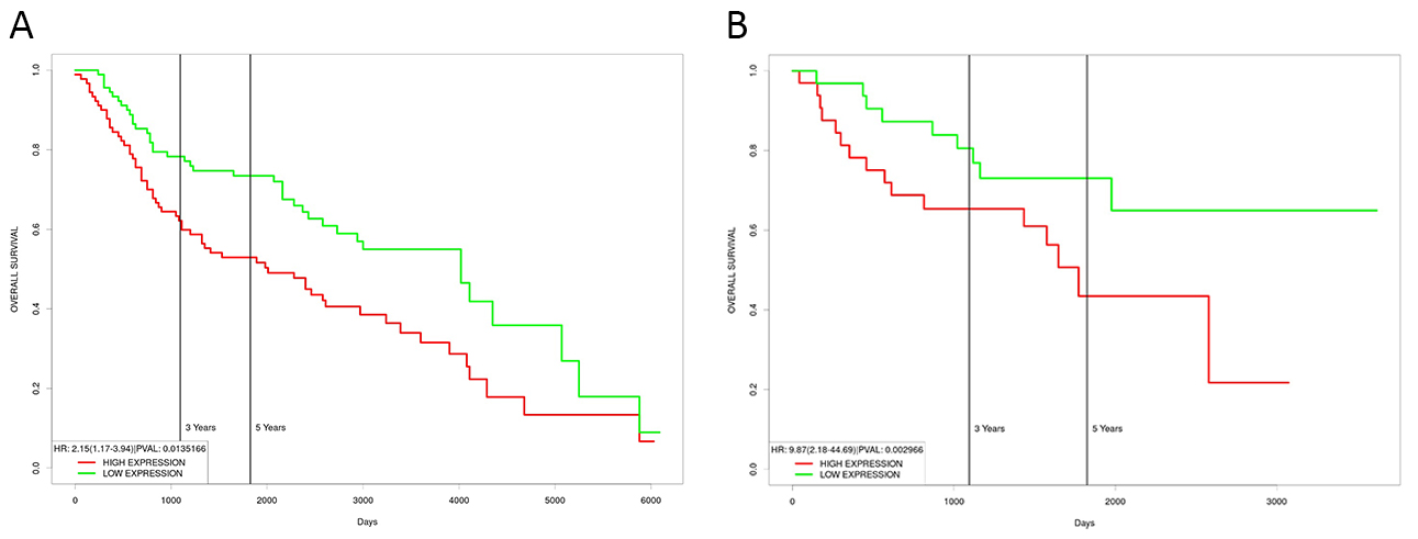 Fig. 2.Survival analysis for patients with CRC according to the expression of MICA mRNA. Plots generated using the prognostic database PROGgeneV2 to analyze the datasets GSE41258 (A) and GSE29621 (B), using the mean value as threshold. In both datasets, a poor prognosis was evident for patients with higher expression of MICA mRNA (log rank, p = 0.014, HR: 2.15, 95% CI: 1.17–3.94 for GSE41258 and log rank, p = 0.003, HR: 9.87, 95% CI: 2.18–44.69 for GSE29621).