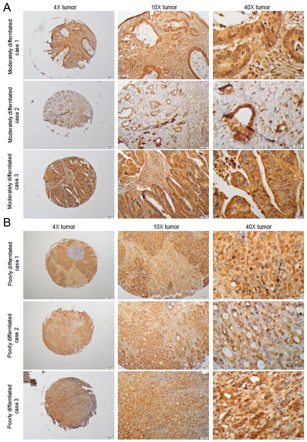 Fig. 4.IHC staining of MICA in moderately and poorly differentiated CRC tissues. Representative microphotographs from different adenocarcinoma cases to show MICA staining in CRC tissues based on (A) moderate and (B) poor differentiation.