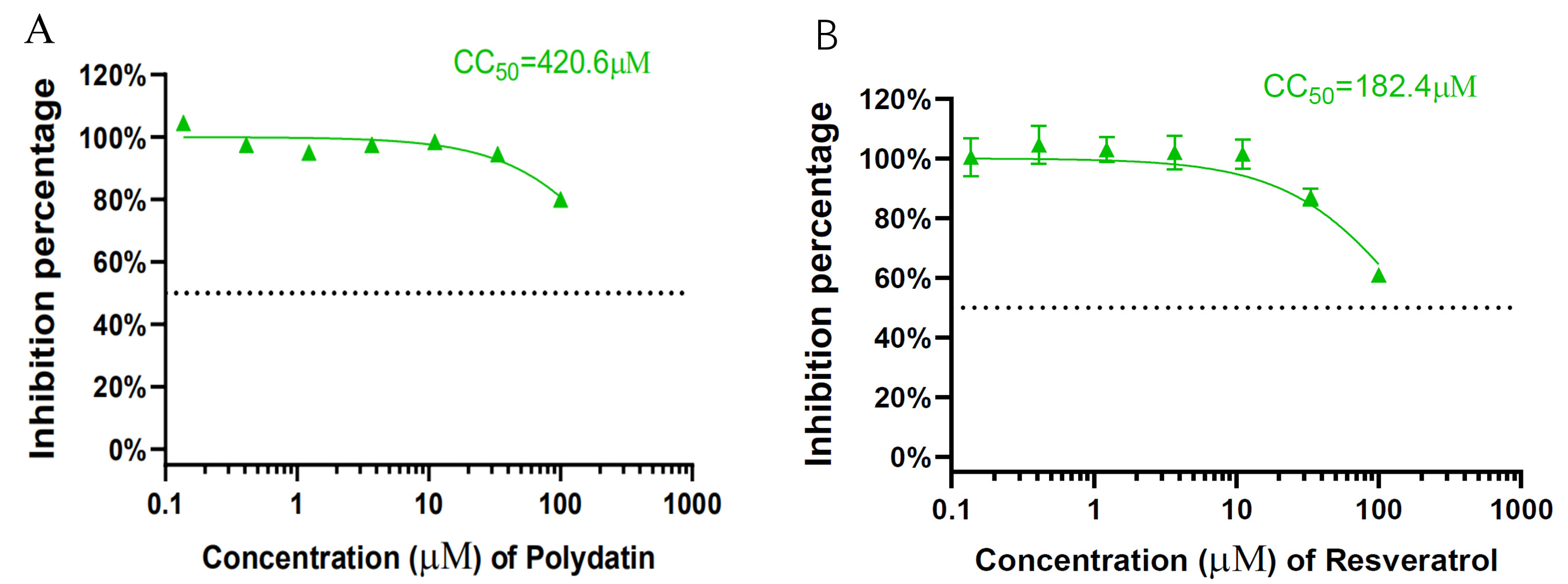 Fig. 2.Cytotoxicity of polydatin (A) and resveratrol (B) to HEK293T-ACE2 cells was measured by CellTiter-Blue assay. The median cytotoxic concentration value was determined by nonlinear regression analysis.