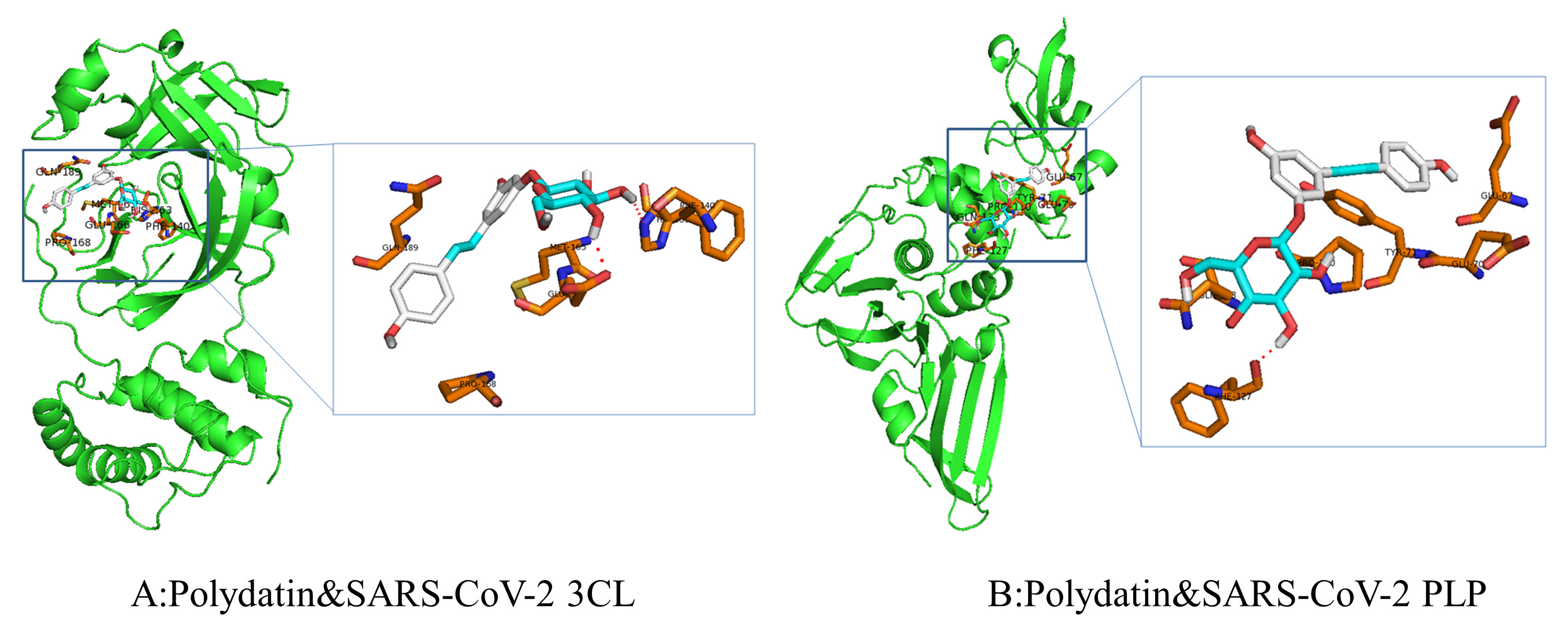 The SARS-CoV-2 3CLP (pdb:6lu7) and PLP (pdb:6w9c) program database (PDB) files were downloaded from the PDB website (http://www.rcsb.org/). All heterogeneous atoms and the 3CLP ligand were removed and 6lu7 chain A was selected for subsequent molecular docking. The 3CLP docking grid was maximized for polydatin docking. All heterogeneous atoms and the PLP ligand were removed and 6w9c chain A was selected for subsequent molecular docking. The PLP docking grid was maximized for polydatin docking.