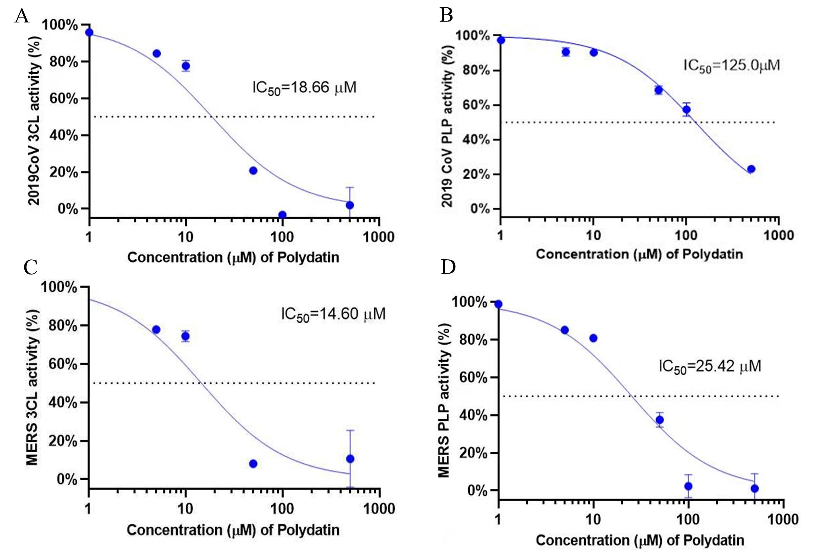 activity of 3CLpro and PLpro (Table 1). Polydatin inhibited SARS-CoV-2 Mpro and