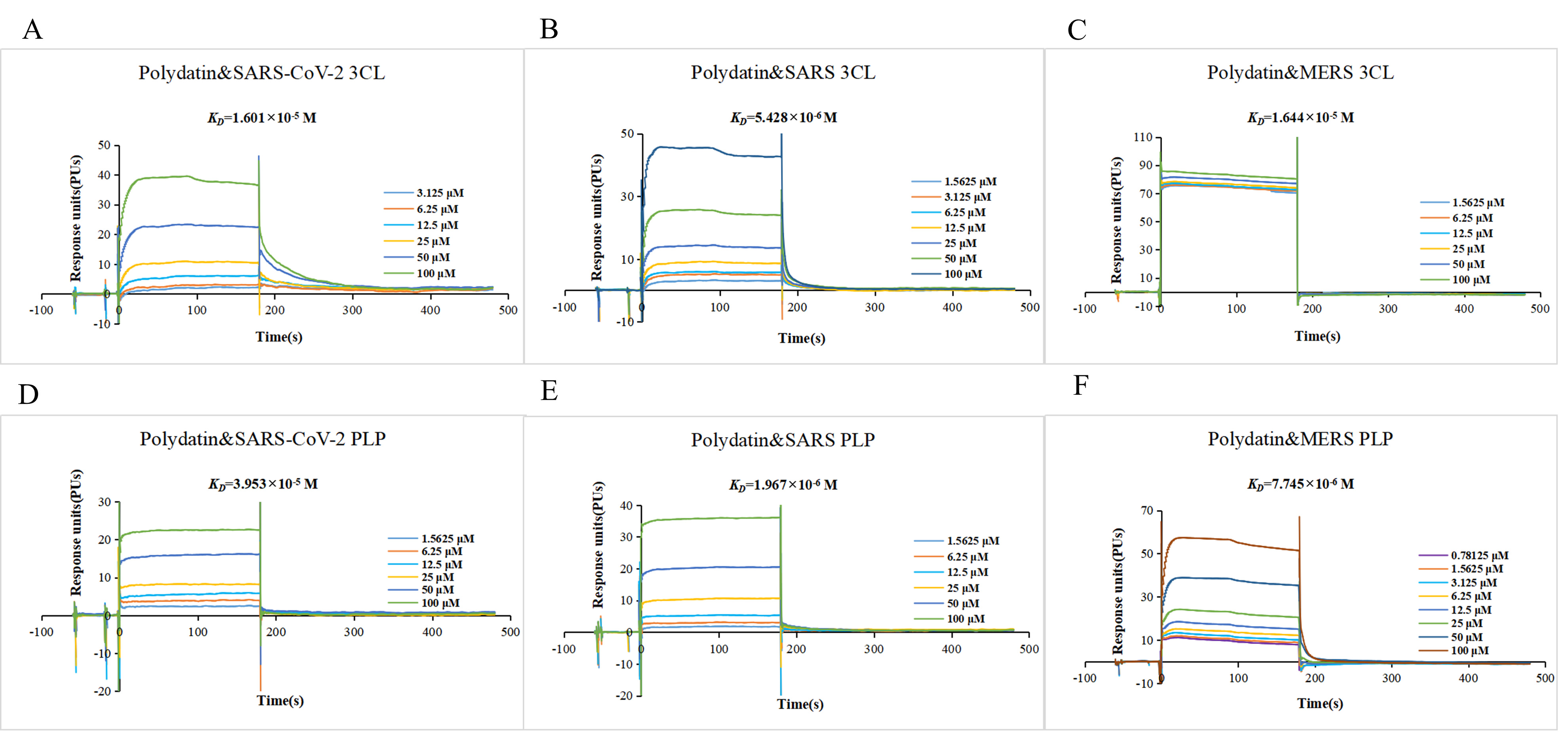 Fig. 6.Polydatin targets 3CLpro and PLpro of the severe acute respiratory syndrome coronavirus 2 (SARS-CoV-2), severe acute respiratory syndrome coronavirus (SARS-CoV), and Middle East respiratory syndrome coronavirus (MERS-CoV) (A–F). The sensor image of 3CLpro and PLpro of SARS-CoV-2, SARS-CoV, and MERS-CoV with polydatin.
