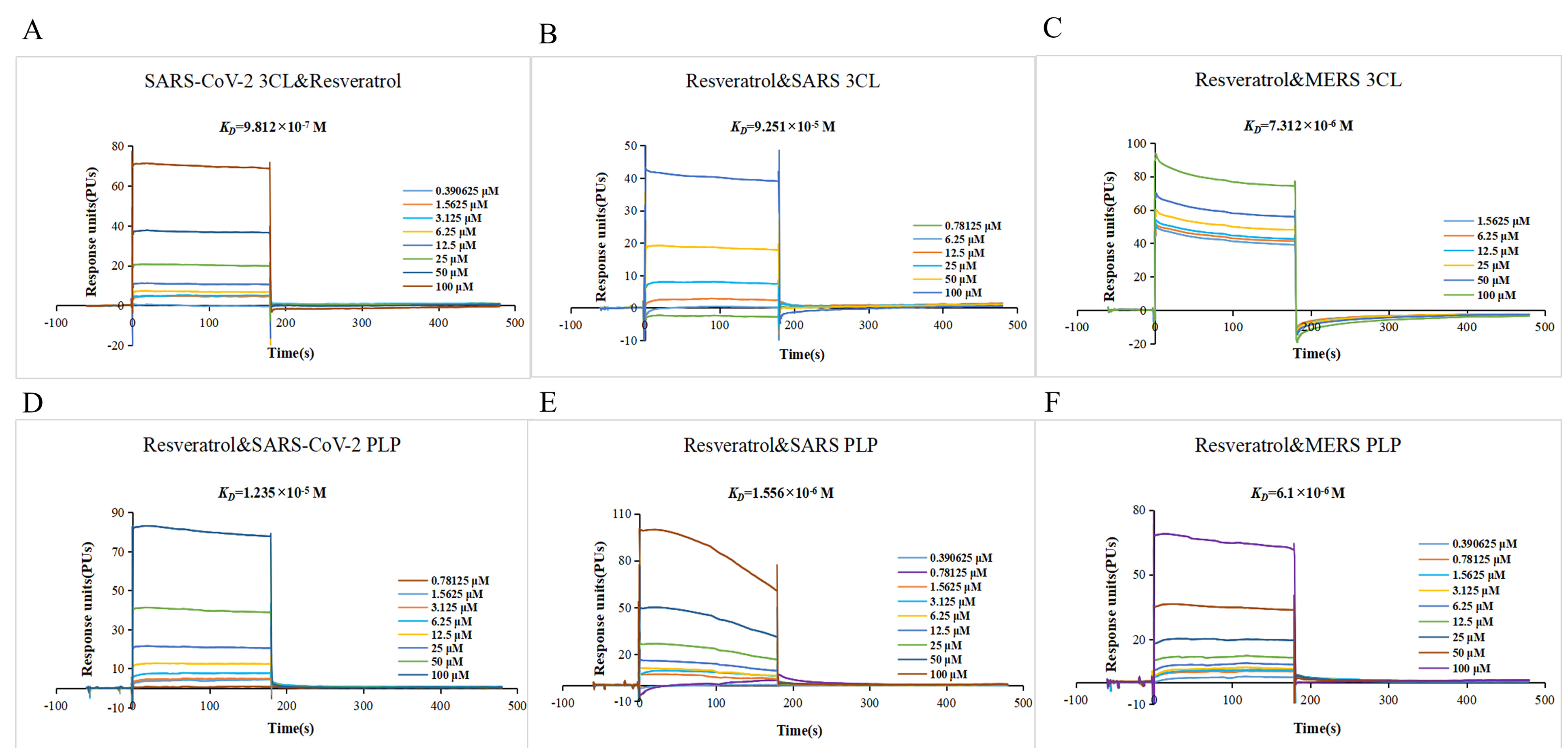 Fig. 7.Resveratrol targets 3CLpro and PLpro of the severe acute respiratory syndrome coronavirus 2 (SARS-CoV-2), severe acute respiratory syndrome coronavirus (SARS-CoV), and Middle East respiratory syndrome coronavirus (MERS-CoV) (A–F). The sensor image of 3CLpro and PLpro of SARS-CoV-2, SARS-CoV, and MERS-CoV with resveratrol.