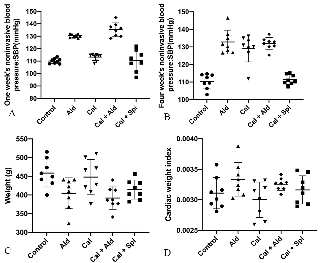 Fig. 1.Physiology index of experimental rats among the different groups. (A) Noninvasive blood pressure of rats after 1week. (B) Noninvasive blood pressure of rats after 4 weeks. (C) Weight of rats. (D) Rats’s cardiac weight index.