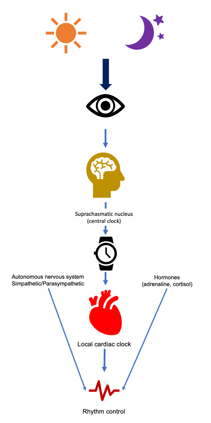 A central clock is located in the suprachiasmatic nucleus of the hypothalamus [2] and most organs and tissues, including the heart, have peripheral clocks [3] (Fig. 1). The light stimuli through the retina reach the central nervous system, are integrated and transformed into output signals to peripheral clocks, aiming to regulate basic physiologic functions: sleep/wake, fasting/feeding, and inactivity/activity [3, 4]. However, there is growing evidence that some peripheral clocks could, at least partially, have autonomous activity [3]. The local cardiac clock is located at the level of the working myocardial cells and the cardiac conduction system [5, 6]. Molecular mechanisms of circadian rhythms are complex [7, 8]. Circadian specific genes (“clock genes”) [1] have been described, that influence numerous regulatory mechanisms since the intrauterine period [7]. The autonomous nervous system with the sympathetic/parasympathetic balance is also influenced by the central suprachiasmatic clock, acting as a communication link that transmits information to peripheral clocks [9, 10]. Glucocorticoids [11] and mineralocorticoids are also part of this signaling communication chain [9].