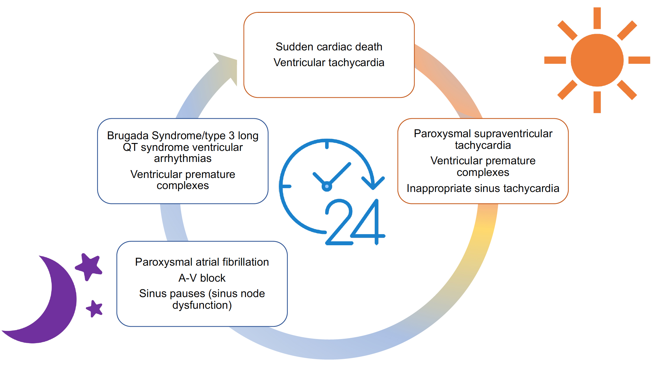 Fig. 2.Representation of the circadian pattern of the most common arrhythmias. All cardiac arrhythmias might be seen at any moment but have different peaks that are represented in this image.