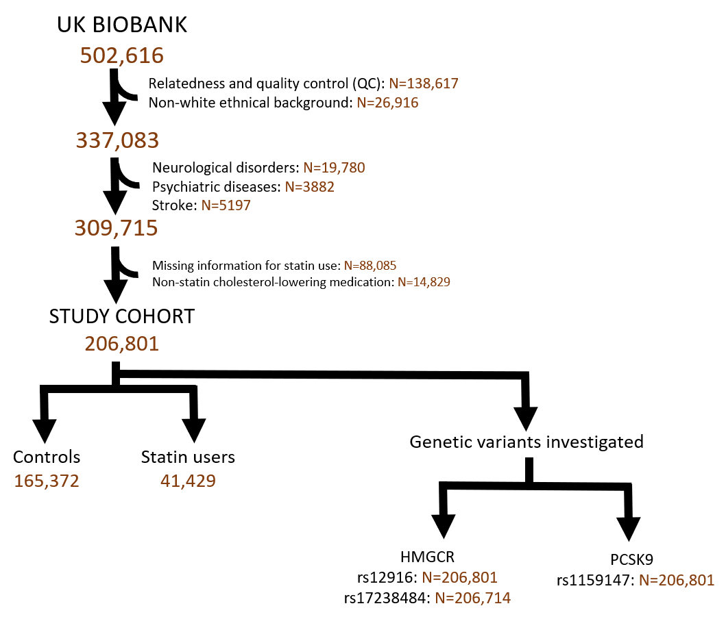 In the current analyses, participants with non-white ethnical background (n = 26,916), genetic relatedness and quality-control failure of the genotyped data (n = 138,617) were excluded (Fig. 1). Moreover, all the participants with neurological (n = 19,916) or psychiatric disorders (n = 3882), or persons who have had a stroke (n = 5197) were excluded to minimize confounding due to these factors. Following these exclusions, 206,801 participants with genetic data as well as information on medication use were included in the present study (Fig. 1). The study participants were then subjected to two independent analyses, i.e., non-genetic and genetic. In non-genetic analyses, statin medication was used as exposure while in genetic analyses, genetic variants were used as proxies for statin use.